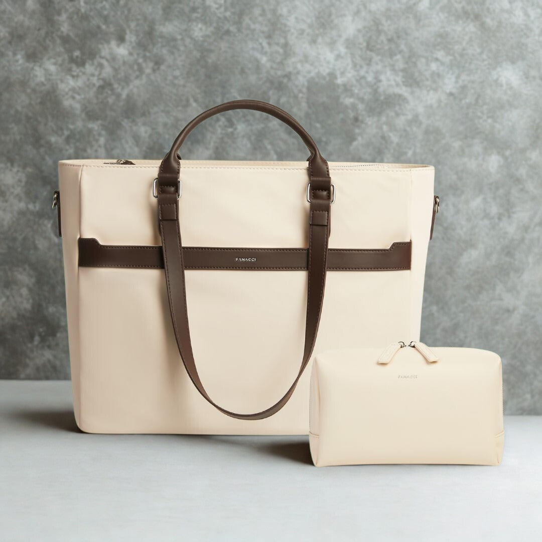 Discover the Trailblazer Tote, a functional bag for work and travel that fits all your essentials, including your laptop and water bottle, paired with the Genuine Leather pouch for toiletries and tech accessories.